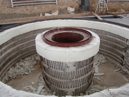 6、爐底部分由于承重,采用高鋁耐火磚砌筑,爐子中芯部位采用大圈套小圈的做法,里外加熱,這樣即增加了爐溫均勻性,又降低了爐子的功率消耗,同時減小了爐子的配置功率,使變壓器的利用空間更大。由于底部沒有電阻絲,我們在上面加了鉻錳氮墊鐵,增加了環(huán)件中間爐溫的流通性。